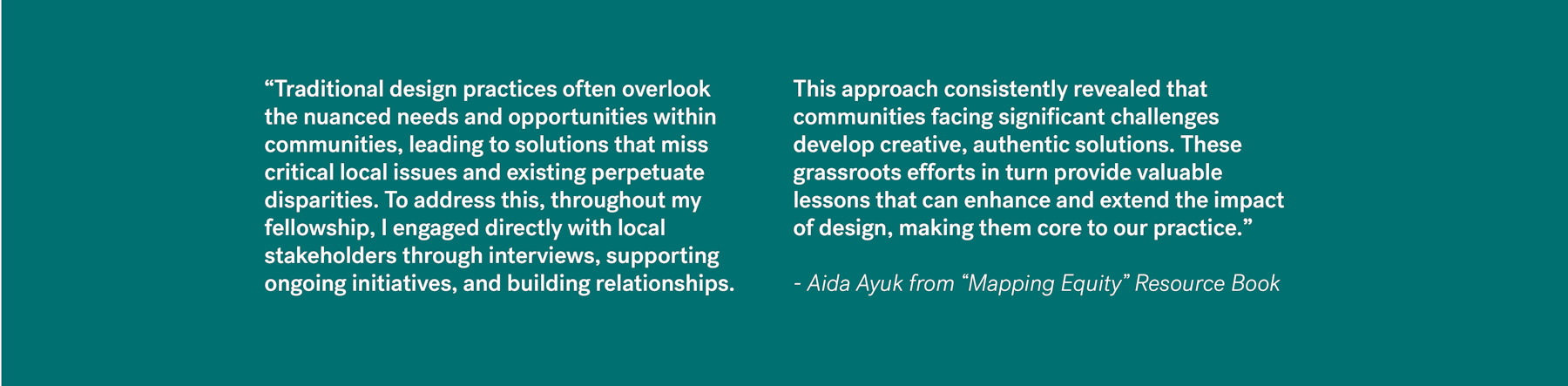 The Just | Change fellowship investigated how design can be a tool for equity by addressing these systemic disparities. Through direct engagement with local organizations and impacted communities, the fellowship explored strategies to embed equity into the design process—translating research into actionable frameworks for future projects.