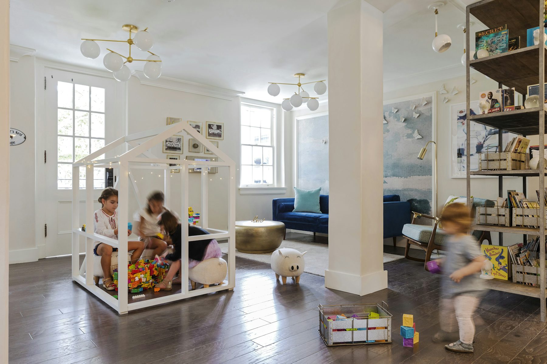 The project partnered local nonprofit Hogs for the Cause with Children’s as part of a new campus expansion, one that ultimately will serve to revitalize nine existing historical buildings onsite for adaptive reuse. The bright, airy home, previously fallen into disrepair, was once a garage and maintenance structure for the hospital. Throughout design, the team worked painstakingly to lovingly restore several elements of the original design. The building’s Georgian Revival façade has been completely restored. Within, little was left to salvage, which gave the design team plenty of space to create a cheerful respite for families. Thirteen suites within provide space for overnight families, in addition to communal space to promote interaction between families and create a community of support within the house. Throughout, the design strived to pay deference to its main benefactor, local nonprofit Hogs for the Cause, with a pig theme scattered throughout.
