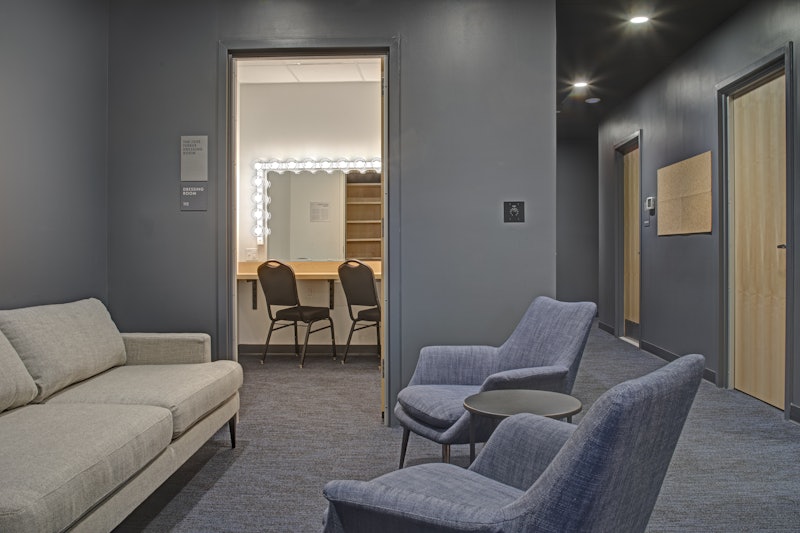 The shaped roof and expansive glazing of the new addition provides a distinctive and recognizable entrance that blends seamlessly into the existing campus architecture. The user experience extends into the lobby where the expressive ceilings replicate the exterior building form. The immediate lobby is a warm, wood-designed space, with adjoining access to the outdoors during intermission or after performances. As guests transition into the black-box theatre their journey is denoted by a liminal area: a blue glowing threshold signaling the start of the performance and entry into the unknown.